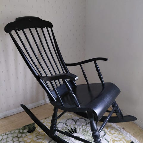 Todella tyylikäs musta kiikkutuoli. Todella jämäkässä kunnossa. Pienet jäljet molemmissa jaloissa koiran hampaista. Helppo kunnostaa jos häiritsee. Vain nouto.