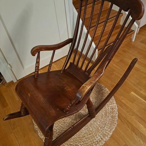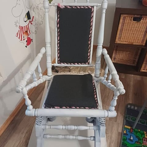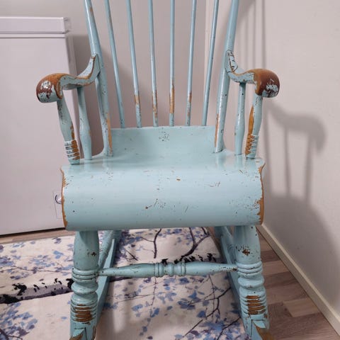 Vanha, Merivaaran keinutuoli. Rautaa, istuinosa taivutettua vaneria. Ollut synnytyssalissa keinutuolina.