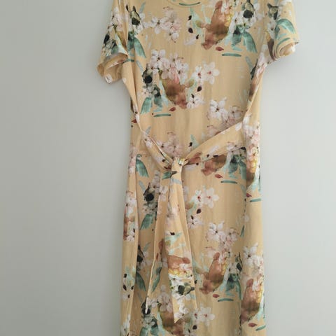 Kaiko Kesämekko vaaleanpunaisena, koko S. Mekossa on kukkakuviointi ja vyötäröllä solmimisnauha.