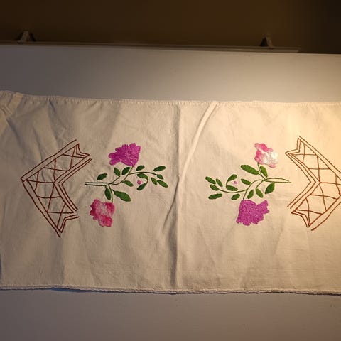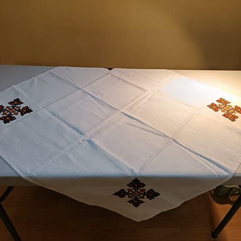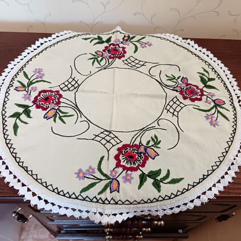 Käsin kirjottu pöytäliina, jonka koko on 57 x 57 cm. Värit ovat beige ja ruskea, ja materiaali on todennäköisesti pellavaa tai puuvillaa. Pöytäliinassa on koristeellinen kirjailu reunoilla ja keskellä, joka muodostaa kauniin kuvion. Soveltuu pöydän kattaukseen tai sisustuselementiksi. Hinta 5 euroa. Voin lähettää. Mmm.