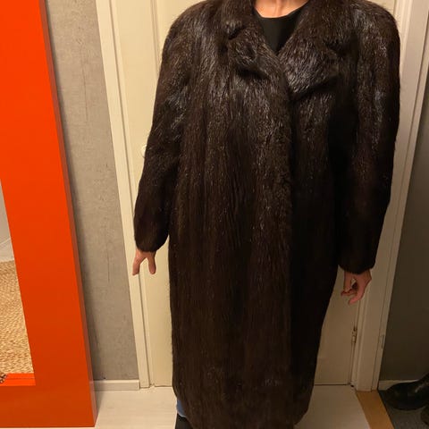 Aito, muutaman kerran käytetty ja hyväkuntoinen A-linjainen naisten minkkiturkki. Valmistaja turkisliike M Huhtalo, Oulu. Turkki valmistettu ehkä 90-luvun lopulla. Koko on reilu, ehkä noin 42/44, käy monenkokoiselle. Saa tulla sovittamaan ! Kauluksen saa laitettua auki tai kiinni (kauluksessa 2 nappia), katso kaikki kuvat. Sivutaskullinen, hihansuissa käänteet. Takissa näkyvät pitkittäissuuntaiset raidat on ruskeaa mokkanahkaa. Koiratalous.