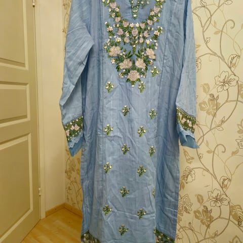 Kuvan teetetty thai silkki kokohame ja jakku. Väri vaalean lila, kiiltävä kangas. Hameessa takana vetoketju. Jakusta saa halutessaan kukkasomisteen pois. Mittoja hameesta: niska-helma noin 140cm, Kainalo-kainalo 58cm, lantio noin 127cm ja vyötärö noin 112cm. Jakun mittoja: niska - helma noin 70cm ja Kainalo-kainalo noin 62cm. Hameessa hieman nukkaa ja vyötärön kohtaa jos venyttää niin sauma hieman irvistää, muuten kunto hyvä mielestäni.