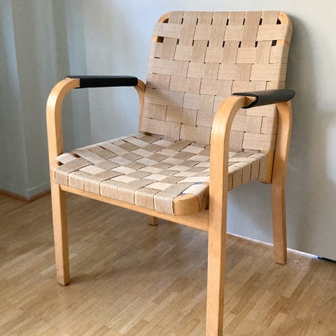 Elämää nähnyt Aallon tuoli. Viiluvaurioita, kankaassa pieni reikä.