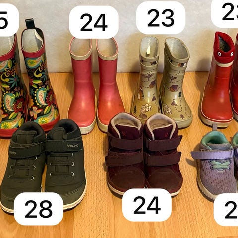 Kumppareita koossa 24-27. 4 euroa per pari taikka tarjoa. Kaupan päälle Reiman välikausikengät k25 ja k28 (mustissa 1 solki rikki). Nouto Vantaan Hämevaarasta.