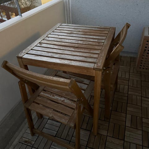 Puinen valkoinen pöytä ja 5 taittuvaa tuolia