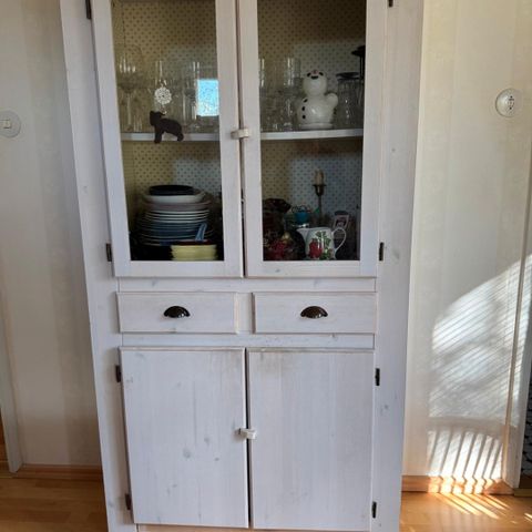 Ikea Hemnes massiivimäntyinen vitriini lasiovilla ja hyllyillä. Kaapin sisällä valot. Leveys: 120 cm, syvyys: 37 cm, korkeus: 130 cm.