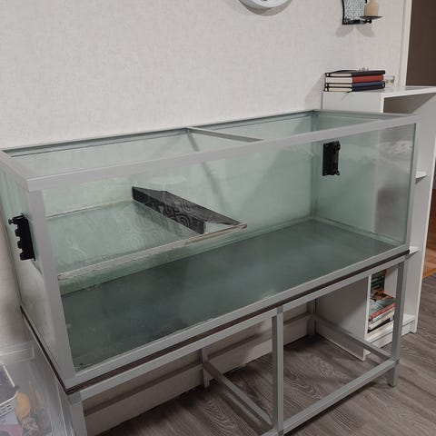 Lasinen terraario, mitat 50 cm × 30 cm × 35 cm. Väliaikaiseksi asumukseksi esim. siivouksen ajaksi tms. Ei sovellu jyrsijöille mittojen vuoksi pysyväksi asumukseksi. Terraariossa muutamia käytönjälkiä (kuvat). Pesty valmiiksi, ei kantta.