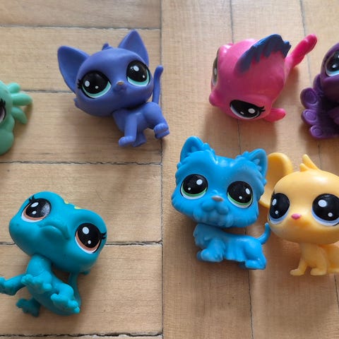 Kahdeksan kappaletta lelufiguureja mm. Littlest Pet shop minifiguurit kuten minikameleontti ja minihämähäkki.