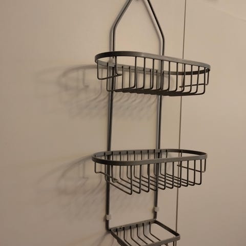 Metallinen kahden tason suihkukaappi hylly, jossa kaksi koria ja koukut alhaalla. Hylly on suunniteltu ripustettavaksi, materiaali metalli, väri hopea. Soveltuu kylpyhuoneen tai suihkun säilytykseen. Nouto Ruokkeelta.