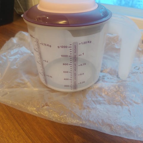 Tupperware. Mittamari tilavuus 1,25 L sivuissa mitat kuiville aineille ja nesteille kannessa vatkausrengas estää roiskeet sähkövatkaimella vatkatessa käyttämätön hinta 28 €