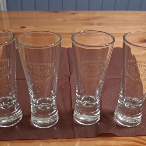 Laseissa teksti: Koskenkorva viina, 1953-2003, suomalaisten huulilla. Siistit lasit 2kpl. Mitat korkeus 10,5cm leveys 4cm. Postitetaan tarvittaessa.