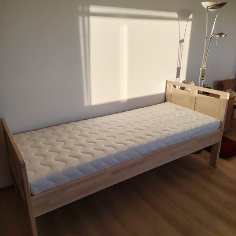 Puinen sohvasänky, jossa on mukana patja. 70x190, levitettynä 140x190. Sänky on valmistettu kestävästä puumateriaalista ja siinä on tukevat sälepohjat. Patja on pehmeä ja mukava, sopii hyvin rentoutumiseen tai vierasvuoteeksi. Puun luonnollinen väri antaa lämpimän ja kodikkaan ilmeen.