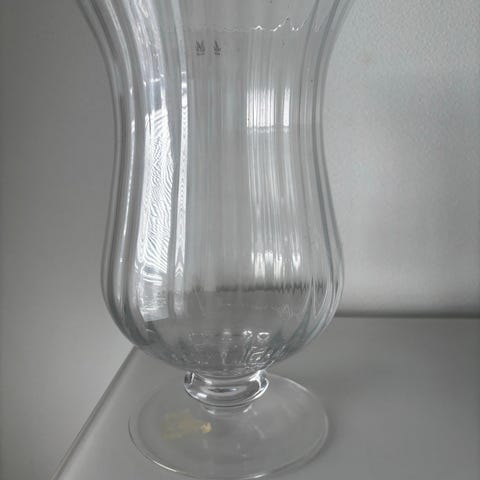 Villa Stockman lasimaljakko kirkasta lasia, reunoitettu pystysuora kuviointi. Sopii kukkien tai koristeiden esillepanoon. Läpinäkyvä väri ja yksinkertainen muotoilu tekevät siitä monikäyttöisen sisustuselementin.