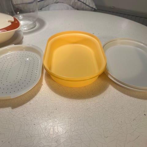 Vesitarjotin, kulho, lävikkö ja kansi kaikki samassa paketissa.