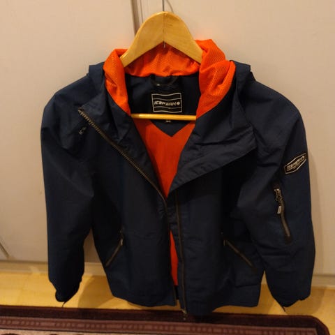 Kuvan paljon pidetty Icepeak merkkinen talvitakki kokoa 176cm (15->). Meillä oli käytössä jo 160 cm koossa. Huppu puuttuu. Tuulen ja vedenpitävä ollut edelleen vaikka paljon pidetty. Hihansuun vihreässä osassa hieman tahraa. Mielestäni hyvä käyttötakki vielä.