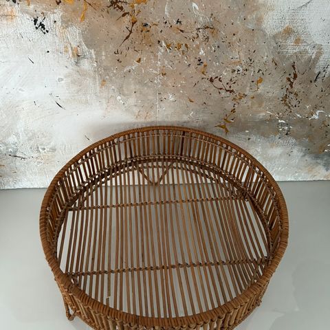 Kaunis tarjoiluastia, lasi lautanen rottinki reunalla ja kahvalla. Halkaisija 23 cm