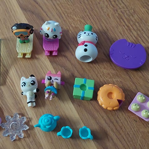 Sekalainen setti leluja. Hahmoja, autoja, eläimiä.
