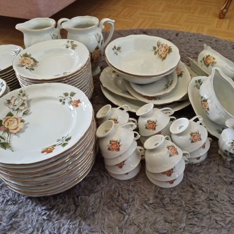 Setti kuulu mokkakuppeje(150 ml) 12 x trio ja 6x trio kahvikuppeja(200ml) keeksilautanen, jalalinen tarjotin, ovaali tarjoitin, lehtikuvio tarjotin, sokerikko, kermakko , kannu! Yhtessä kahvikupissa värimuutosta! Löydy kultauksen vähästä kulumista! Vain nouto!