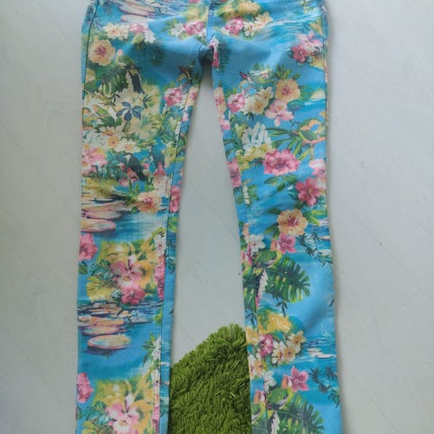 AMISU Kirjava Housut Naisten Koko 32. Housut ovat kirjavan väriset ja valmistettu viskoosista sekä polyamidista sisältäen elastaania joustavuuden lisäämiseksi. Soveltuvat naisille, koko 32.