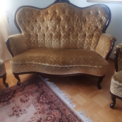 Hyväkuntoinen sohva, 2 tuolia ja pöytä. Sohvassa yksi tahra joka näkyy viimeisen kuvan keskellä. Puuosat naarmuttomat ja täysin ehjät.