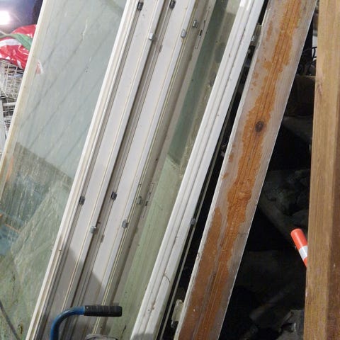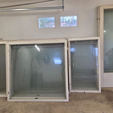Myydään vanhoja ikkunoita pokineen. Karmeja ei ole. Patinaa on, ulkopuolen osissa maalihalkeamia. Mukana on heloja ja hakoja yms. tuon ajan lisäosia. Valmistusajankohta huomioiden (n.1950 -luku) nämä ovat sinänsä huippulaatuista puutyötä sekä puuosien puun laatu ykkösluokkaa. Kunnostettavaksi tai esim. kasvihuoneen tekoon. Lasit ehyet, vain yhdessä ikkunassa lasihalkein. Myydään pesemättöminä. Myynnissä on seuraavat koot ja kappalemäärät: