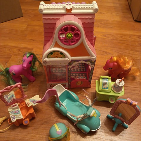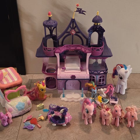 Myydään herttainen "My little pony" setti, jossa kaksi baby ponia, hoitopöytä, keinu ja hoitovälineitä. Ponien korkeus 6 cm ja pituus 8 cm.