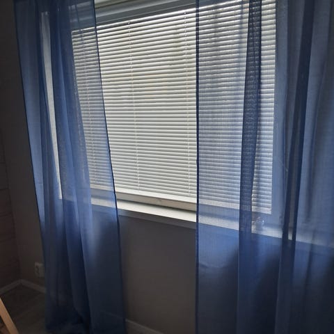 Suorat verhot eläväpintaista puuvillasekoitekangasta.