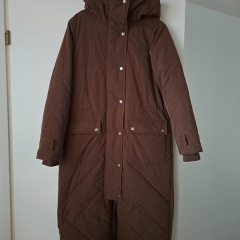 Objectin ruskea muhkea ja pitkä toppatakki. Koko M, rento malli. Tummentumaa taskujen reunoissa ja hihansuissa, ei juuri käytössä huomaa. Kauluksen sisäpuolella vaaleaa ähryä. En ole yrittänyt näihin tahranpoistoa, kun ei päädy itselle käyttöön.