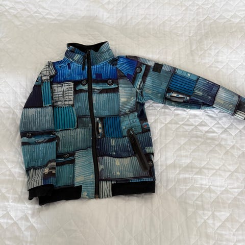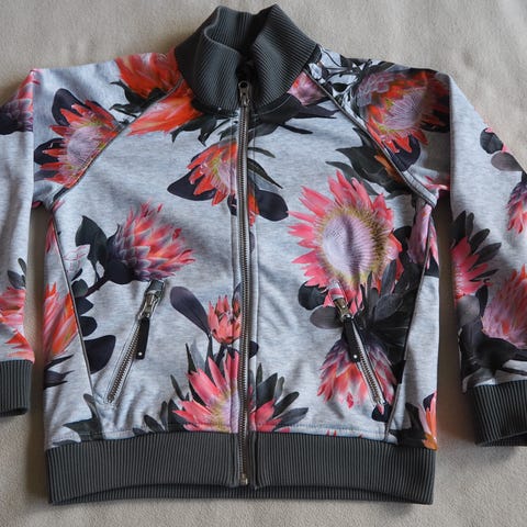 Molon kuosi on nimeltään Wild Cats, ja siinä on eri kissaeläimiä. Oikein onnistunut kuosin kohdistus tässä takissa. Ei kulumia heijastinnauhoissa. Kaulukset ja hihansuut ehjät. Meillä käytetty vain kauppatakkina, siksi säilynyt niin hyvässä kunnossa.