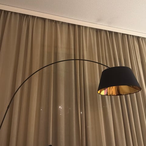 Musta ja moderni lattiavalaisin, jossa on kaareva jalka sekä säädettävä lampunvarjostin halkaisijalla 25cm. Valaisin on suunniteltu käytettäväksi tavallisella hehkulampulla. Soveltuu erilaisiin sisustustyyleihin ja valaistustarpeisiin, toimii loistavasti kohdevalona. Helppo puhdistaa. Ei ole naarmuja.