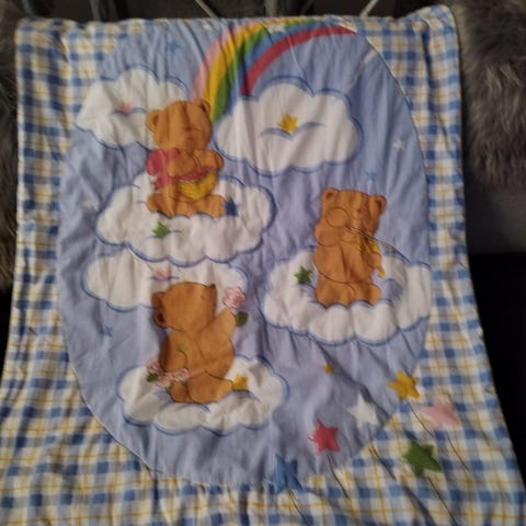 Myydään siistit ja pestyt, lasten vieraskäytössä olleet peitto 115x130cm sekä tyyny 40x45cm.