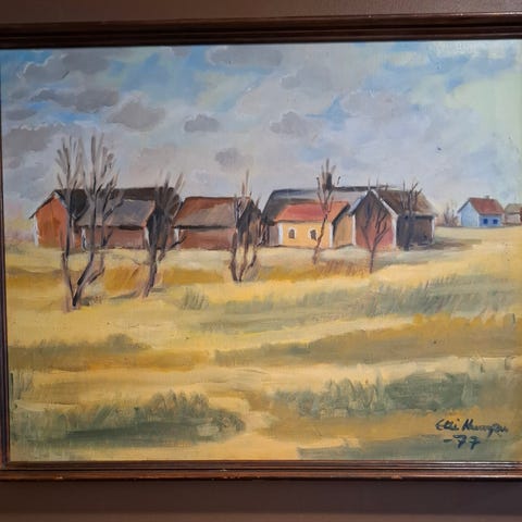 Onni Kurkela ( taidemaalarin nimi voi toki olla joku muu ,meidän tulkinta on Onni Kurkela) Maisema -öljyvärimaalaus, jossa on maisemakuva ja tummahko kehys. Maalaus on kehystetty ja sen koko on noin 70 cm x 60 cm.