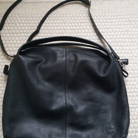Kazar musta nahkalaukku tai keinonahka. En ole varma. Todella pehmeä. Tilava!