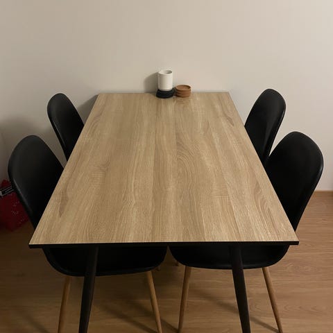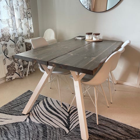 käytetty, huomattava: 6 tuolia hintaan 85 euroa, pöytä: 55 euroa Pöydän mitat: leveys 84, pituus 140 Pöytä on jaettu kahteen 40 senttimetrin osaan