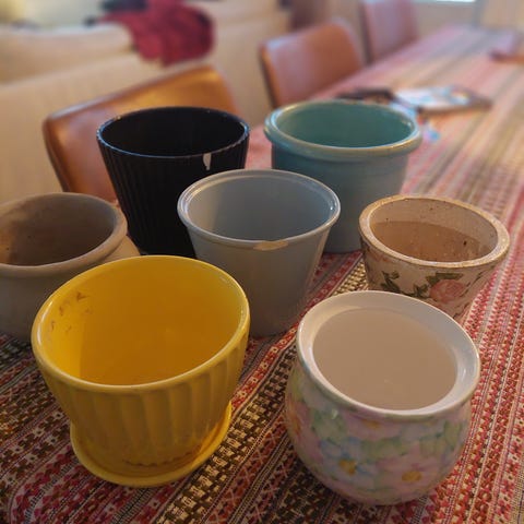 Muoviset kukkaruukut ja yksi aluslautanen