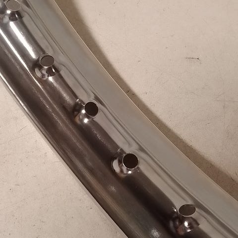 Myytävänä kuvissa oleva uusi kromattu teräksinen 17 tuumaiselle renkaalle (sopii 2,50x17 ja vielä paremmin 2,75x17) n. 52 mm kokonaisleveydeltään oleva vannekehä, jonka pinnareiän halk. on 7 mm. Leveys renkaan kohdalta 38mm. Yleisin 36 reikäinen kehä.