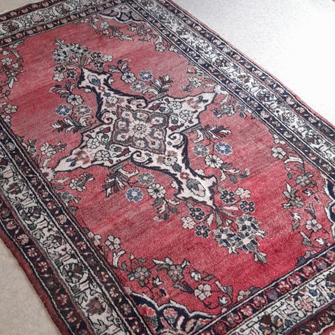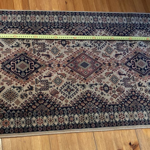 Käsin kudottu Kazak villamatto. Maton toiselta puolen reunoista langat vähän hapsottavat, mutta muuten matto on hyvässä kunnossa. Keskellä mattoa on painaumaa, mutta johtuu varmaan siittä, kun se on ollut varastossa taiteltuna.