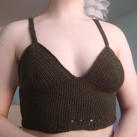 Uusi virkattu toppi. Alareuna melko tiukka, mutta muuten joustaa. Selässä säädettävä nyöritys. Vastaa kokoa S-L
