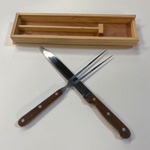 lihapiikki ja veitsi setti, valmistettu ruostumattomasta teräksestä. Setti sisältää kaksi osaa, lihapiikin ja veitsen, jotka on suunniteltu lihan leikkaamiseen ja tarjoiluun. Mukana alkuperäinen säilytyslaatikko, joka suojaa välineitä ja helpottaa säilytystä.