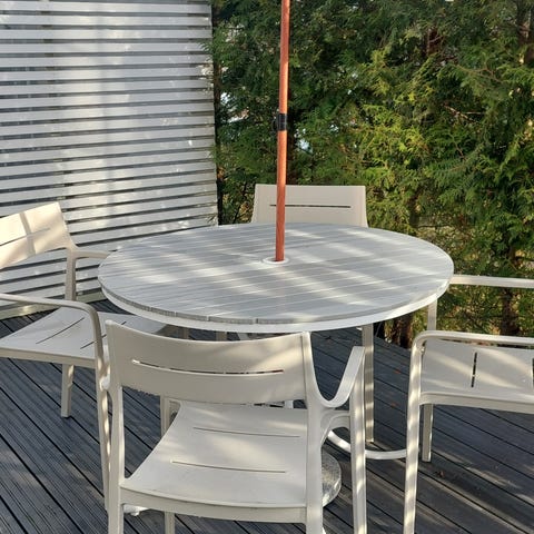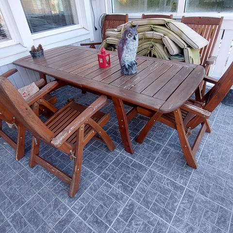Legendaarinen sarja. Pidetty kesäisin terassilla ison liinan kanssa 8-hengen settinä. Talvella suojassa. Muovia ja on kätevä kun kuivuu nopeasti. Muutamassa tuolissa pienet halkeamat joita en ole koittanut korjata. Mahdollista myydä myös 4xtuoli+pöytä setteinä erikseen. Nouto janakkalasta tai kuljetus onnistuu sovitulla hinnalla. Kulkeutuu Lahteen asti sekä kanta-Hämeen alueella. Tarjoa