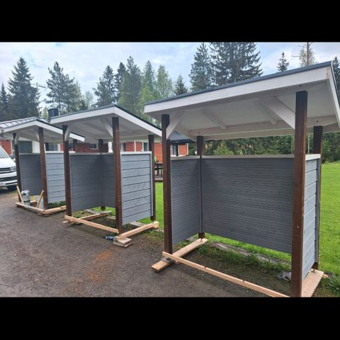 240 litran roskikselle näppärä katos. Runko 48×48, paneeliverhous ja peltikatto. Paneelit pohjamaalattu valkoiseksi.