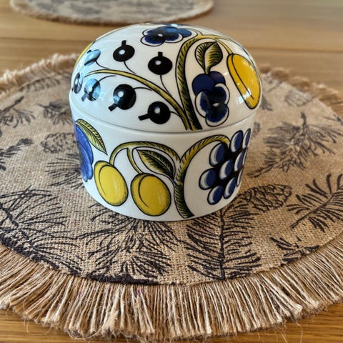 Käyttämättömät Arabian Paratiisisarjan liemimalja (2,8L) ja kannellinen rasia (0,43L). Elämänsä ajan ovat istuneet käyttämättöminä näytillä suunnitteluliikkeessä ja nyt kotitaloudessa vitriinissä.