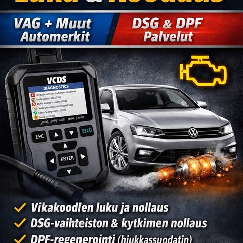 Vag-konsernin autoihin vikakoodin luku ja nollaus harrastehinnoin, käytössä VCDS, toimii volkswagen, audi, seat, skoda ym vuoden 2024 autoihin asti. Onnistuu vaikka kotipihassa.