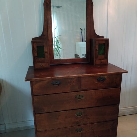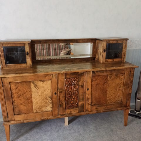 Antiikkinen puinen peilikaappi, jossa on suuri peili yläosassa ja kaksi kaappia alaosassa. Kaappi on varustettu koristeellisilla veistetyillä yksityiskohdilla ja kahdella laatikolla. Sopii säilytykseen ja sisustuselementiksi.
