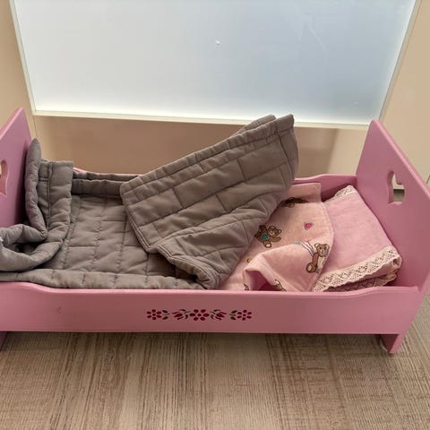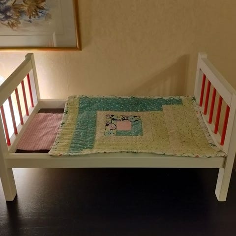 Nuken sänky. Mukaan saa valkoisen lakanan ja viltin. Sänky on muuten puuta, mutta pohjalevy vaneria. Jonkun verran pientä käytönjälkeä.