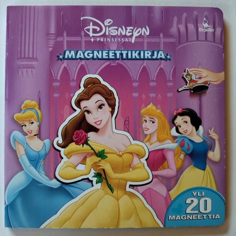 Prinsessa aiheinen setti: lahjakassi 26x33 cm, Prinsessa - puuhalehdet (osa tehtävistä tehty, juliste Mulan/Pocahontas), kirjat Tuhkimo ja Lumikki ja seitsemän kääpiötä, Tuhkimo dvd, timantti "maalaus" setti (uusi), värityslehtiö, 3 x tarra-arkki (muutama tarra otettu), hamahelmialusta.