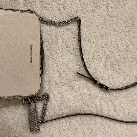 Myyn kohtalaisessa kunnossa olevan Michael Korsin pienen ruskean/beigen käsilaukun. Jos läheltä katsoo niin laatassa on muutama kolhu ja nahkaosiossa kuluma. Sisävuoressa jälkiä myös.
