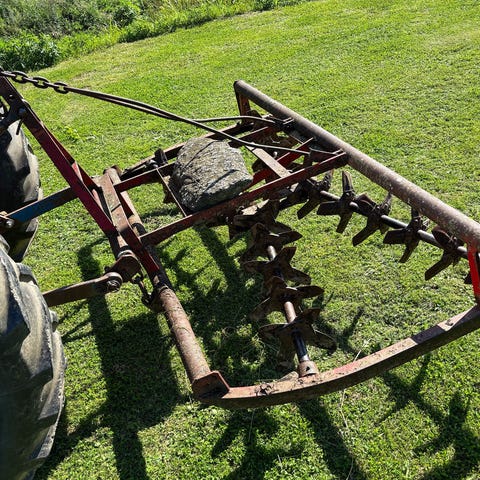 Maatalouskuokka on valmistettu metallista ja soveltuu maatalouskoneen lisävarusteeksi. Se sisältää useita piikkejä ja on suunniteltu maaperän käsittelyyn. Laite on käytetty ja siinä on näkyvää kulumaa ja ruostetta.