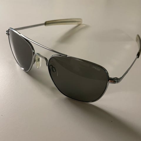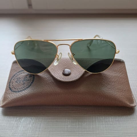Randolph engineering Aviator aurinkolasit. 140mm, kullanväriset metalliosat, polarisoidut linssit. Ostettu Yhdysvalloista noin 15v sitten. Linssissä muutama hento naarmu ja muoviosissa myös pientä kulumaa.