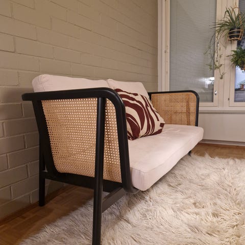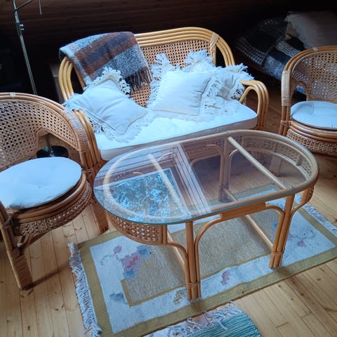 Rottinki sohvaryhmä, joka sisältää sohvan, nojatuolin ja pyöreän lasipöydän. Sohvaryhmässä on ruskeat pehmusteet ja tyynyt. Materiaalina on rottinki, ja väri on musta runko yhdistettynä ruskeisiin verhoiluihin. Sopii sisä- ja katetuille terassialueille. Maalattu mustaksi ja jonkin verran maali lähtenyt.